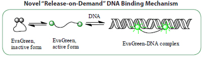 图 1. EvaGreen® dye binds to dsDNA via a “release-on-demand” mechanism.