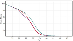 图 4 . 在 Rotor Gene 6000 上使用 EvaGreen 进行高分辨率熔解曲线( HRM )分析可以明显的区分三个不同的基因型:突变型(红色)、杂合型(紫色)和野生型(蓝色)。(数据由 Corbett Research 提供)