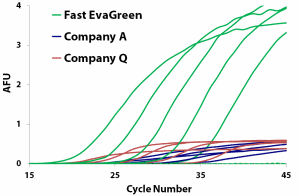 图3. 比较Biotium公司的 Fast EvaGreen master mix (green)和 A公司 (blue) 和 Q公司 (red)fast SYBR Green master mixes, 显示相比 SYBR Green,EvaGreen 有着超级灵明度。